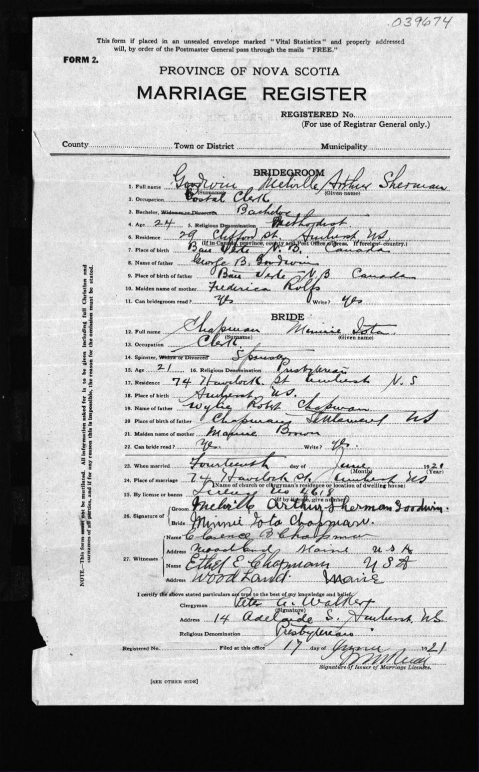 Registration: Year: 1921 number: 39674