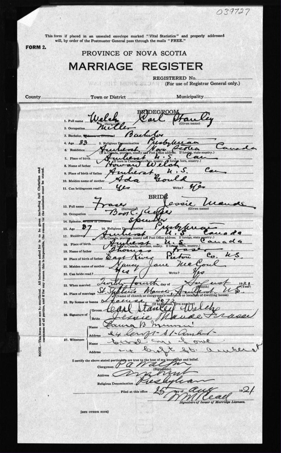 Registration: Year: 1921 number: 39727