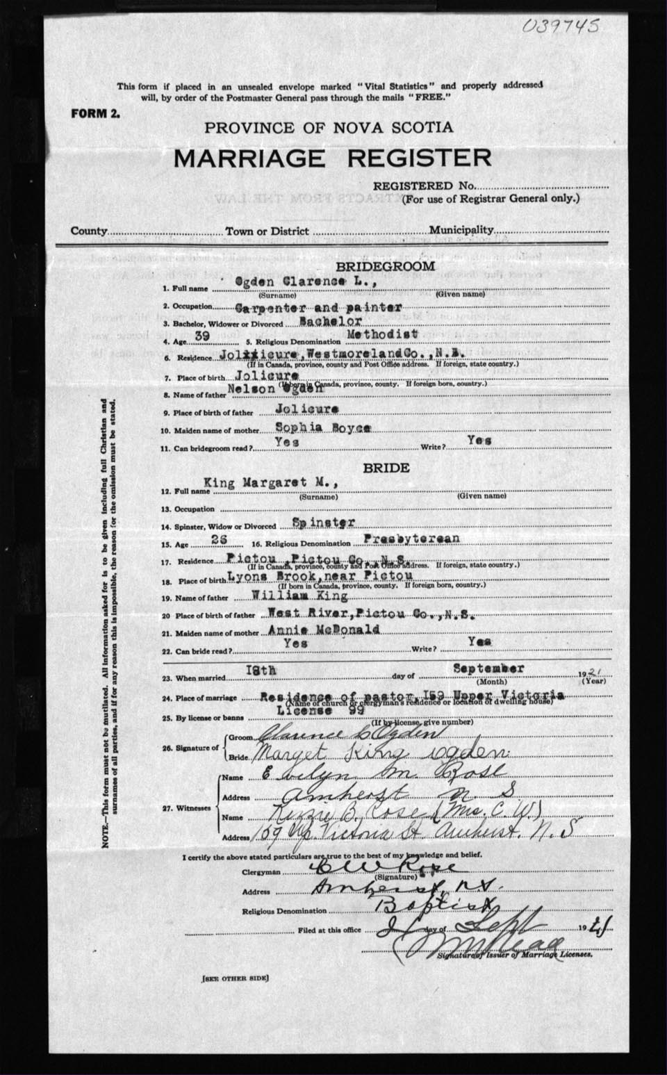 Registration: Year: 1921 number: 39745