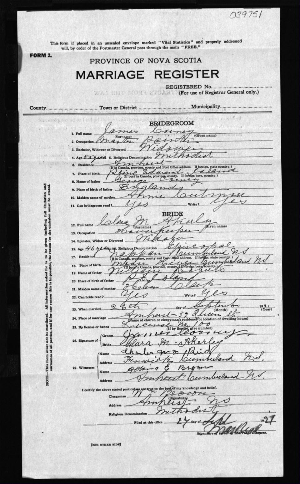 Registration: Year: 1921 number: 39751
