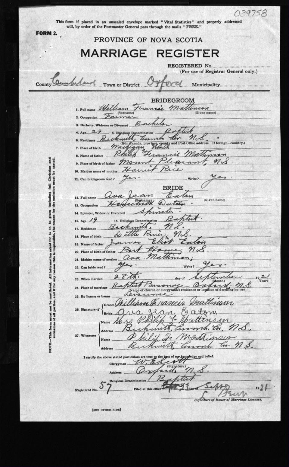 Registration: Year: 1921 number: 39758