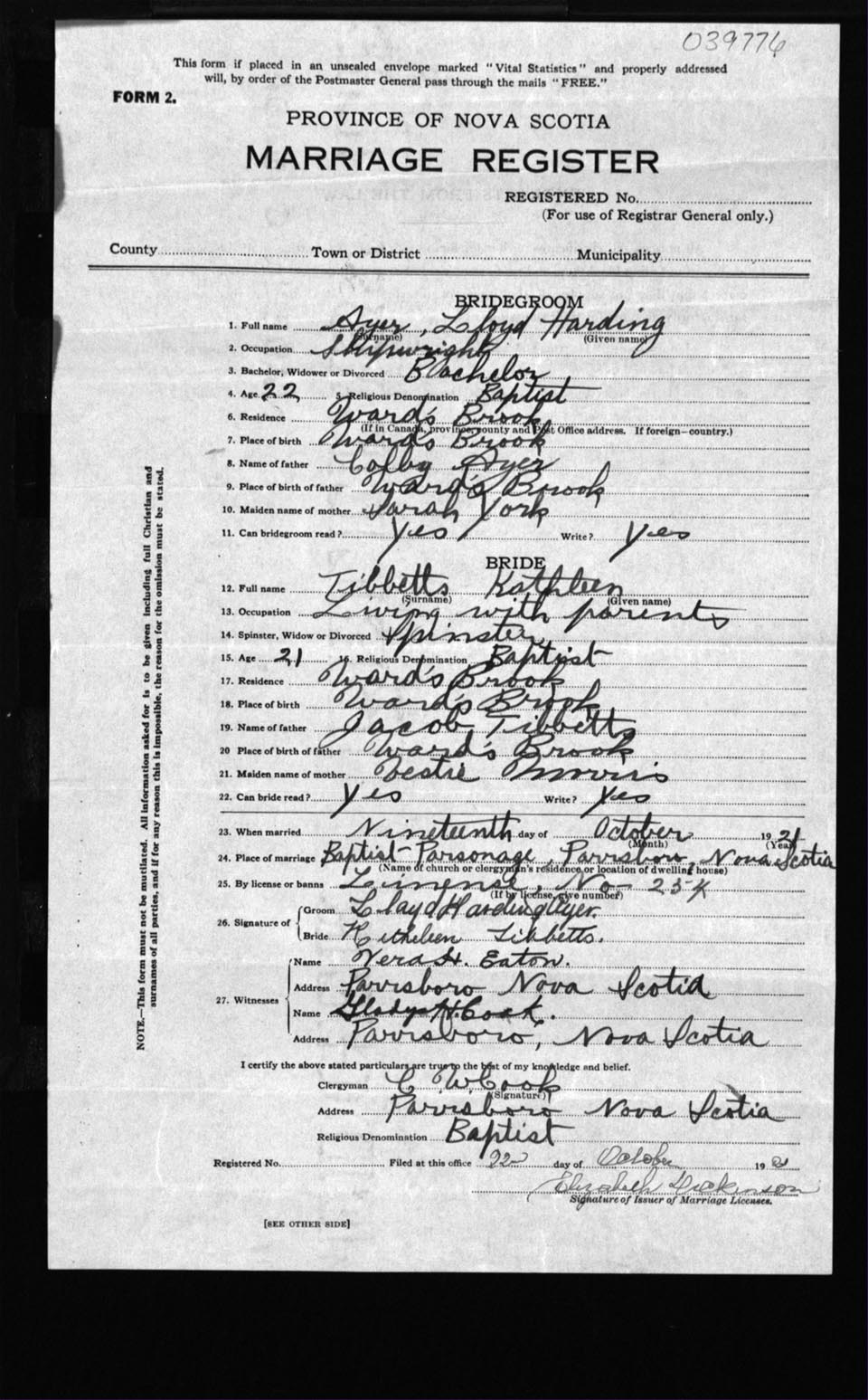 Registration: Year: 1921 number: 39776
