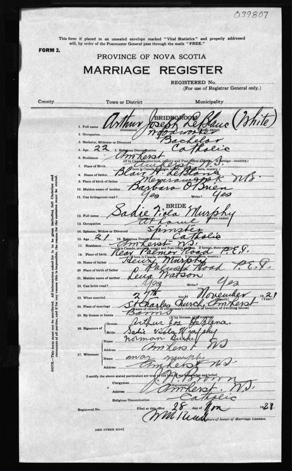 Registration: Year: 1921 number: 39807