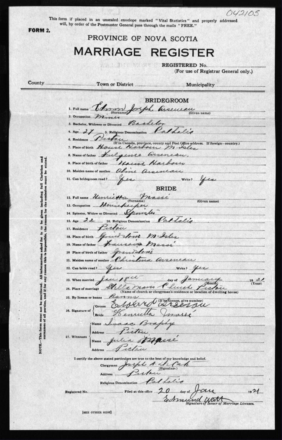 Registration: Year: 1921 number: 42105