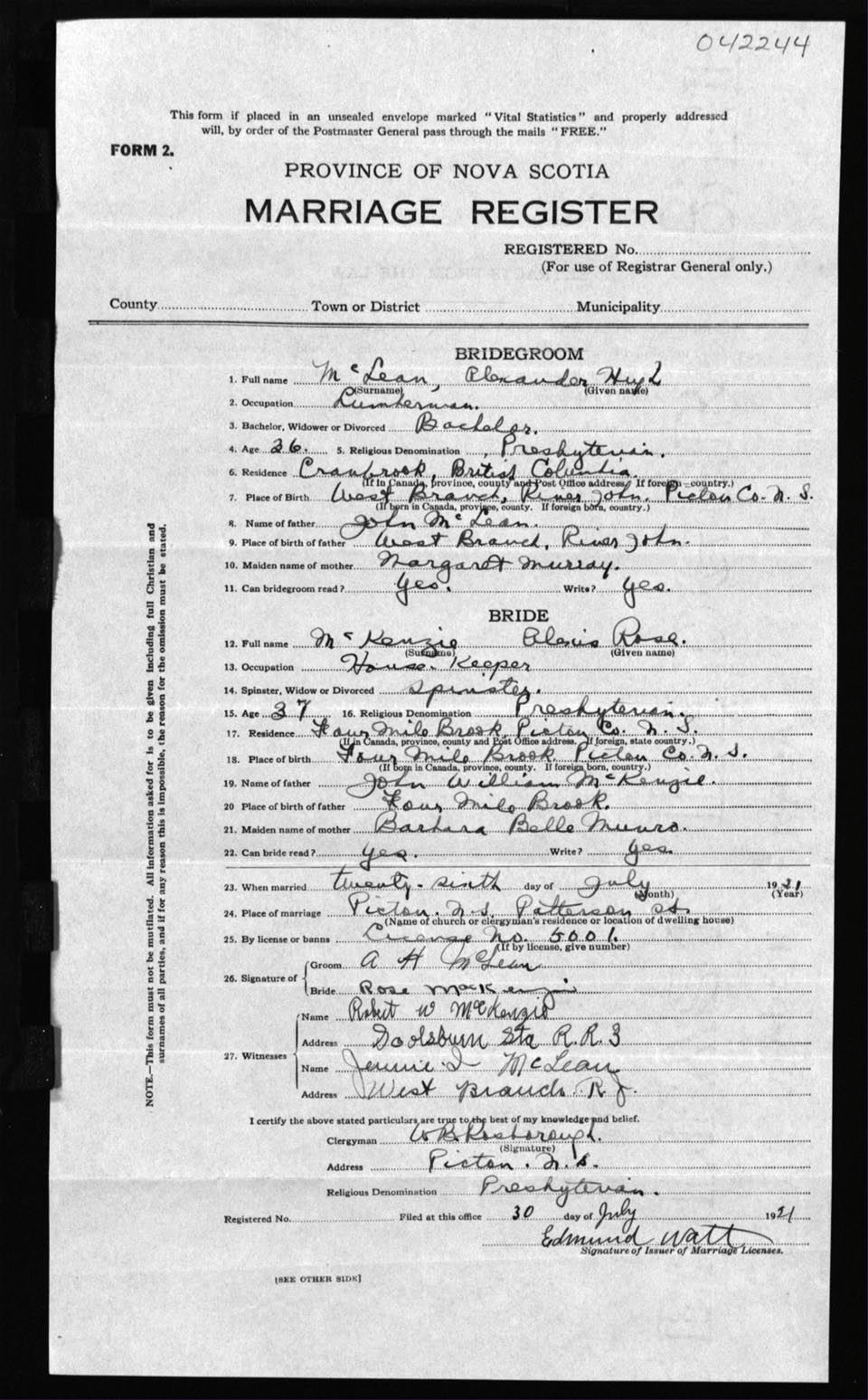 Registration: Year: 1921 number: 42244