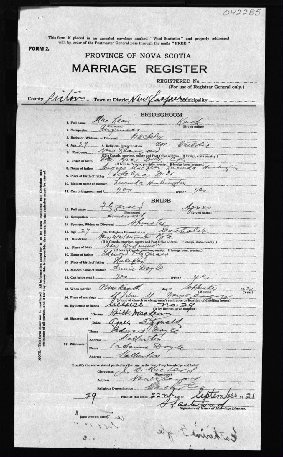 Registration: Year: 1921 number: 42285