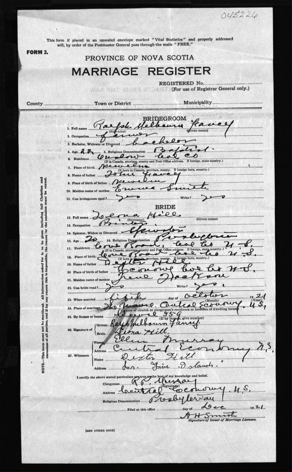 Registration: Year: 1921 number: 45226