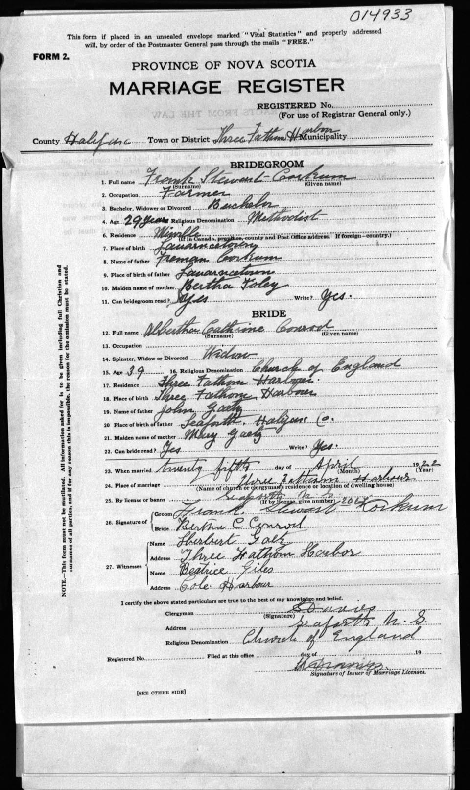 Registration: Year: 1922 number: 14933
