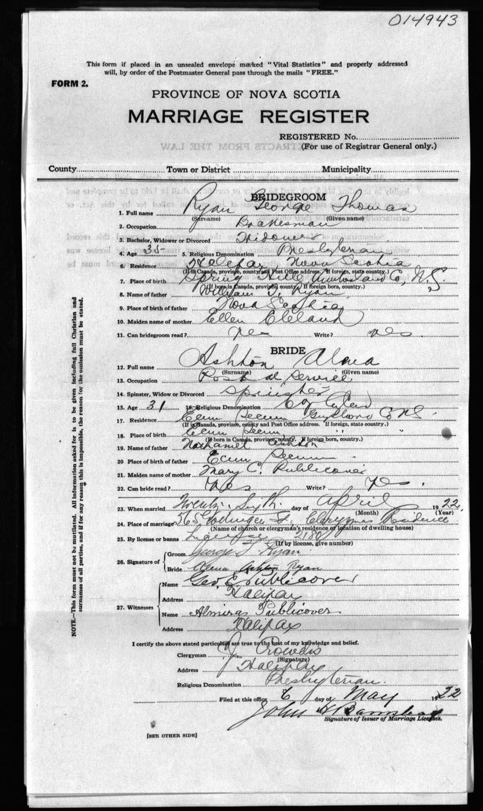Registration: Year: 1922 number: 14943