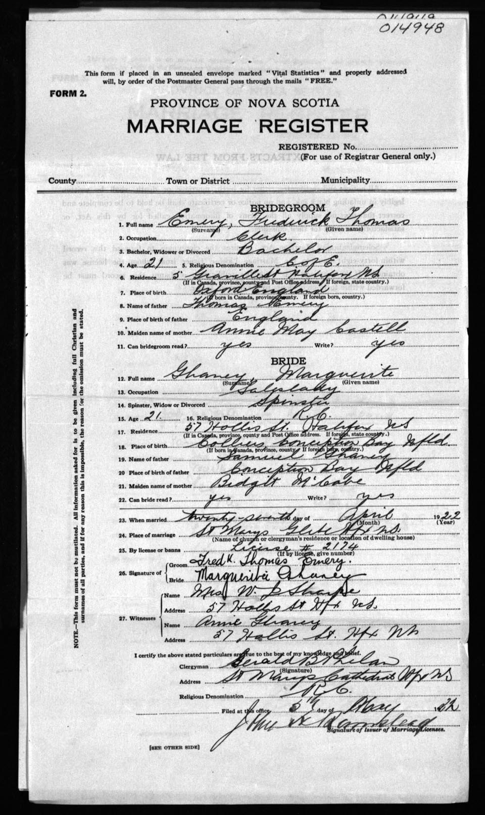 Registration: Year: 1922 number: 14948