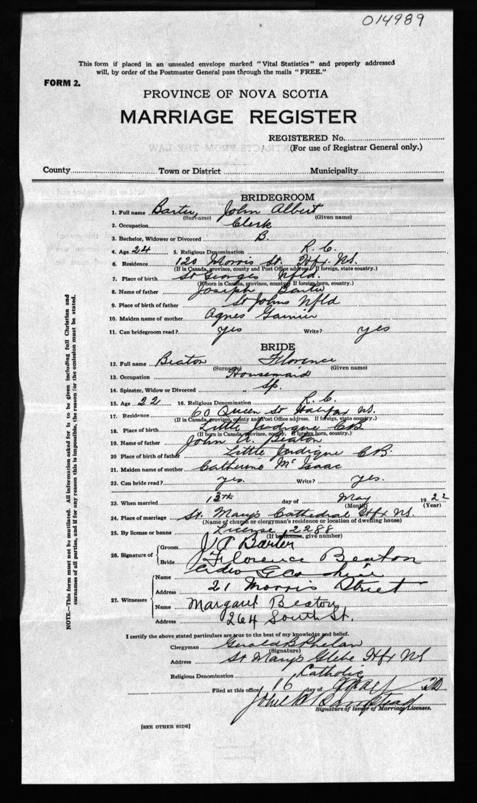 Registration: Year: 1922 number: 14989