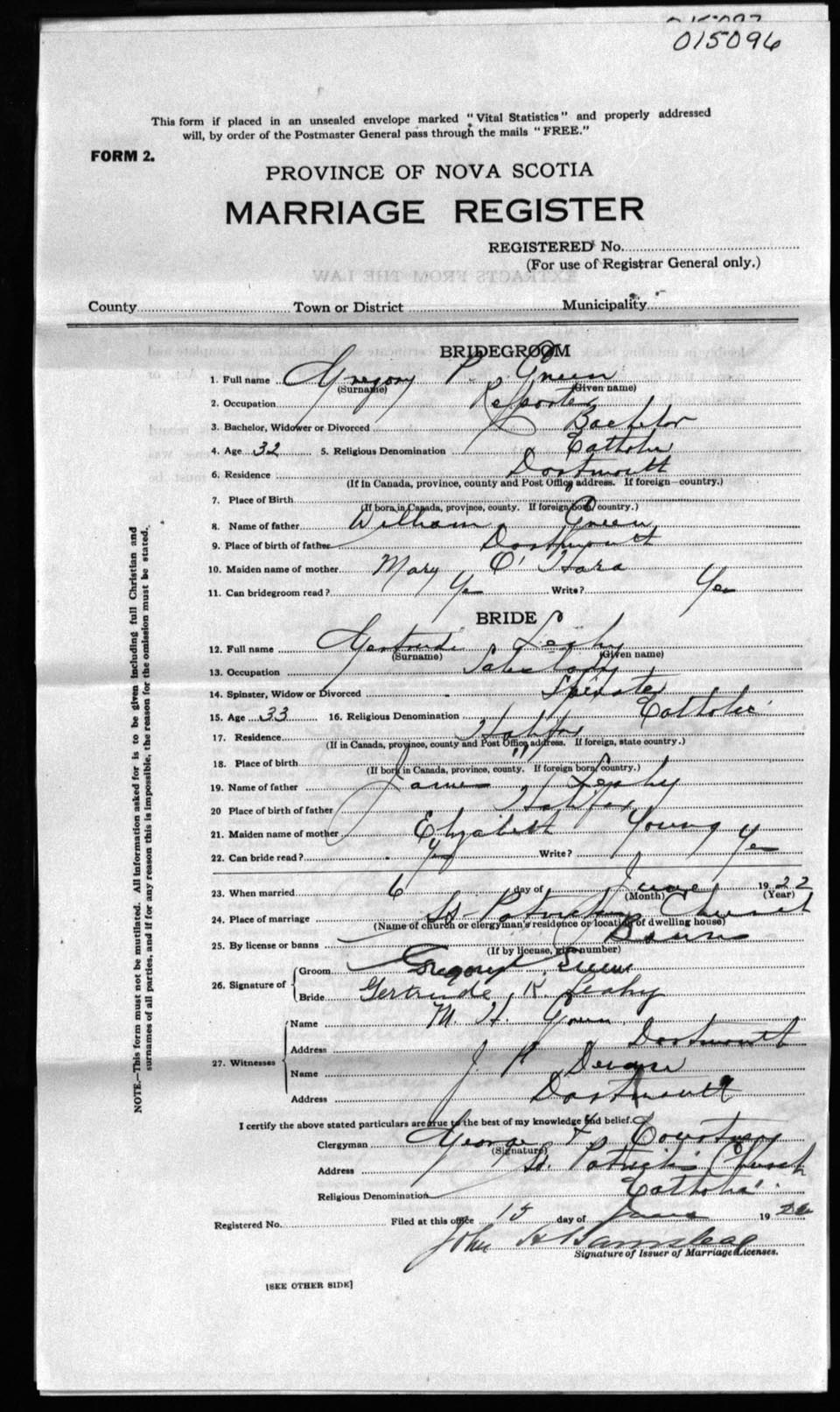 Registration: Year: 1922 number: 1596