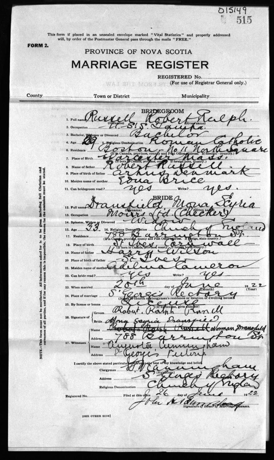 Registration: Year: 1922 number: 15149