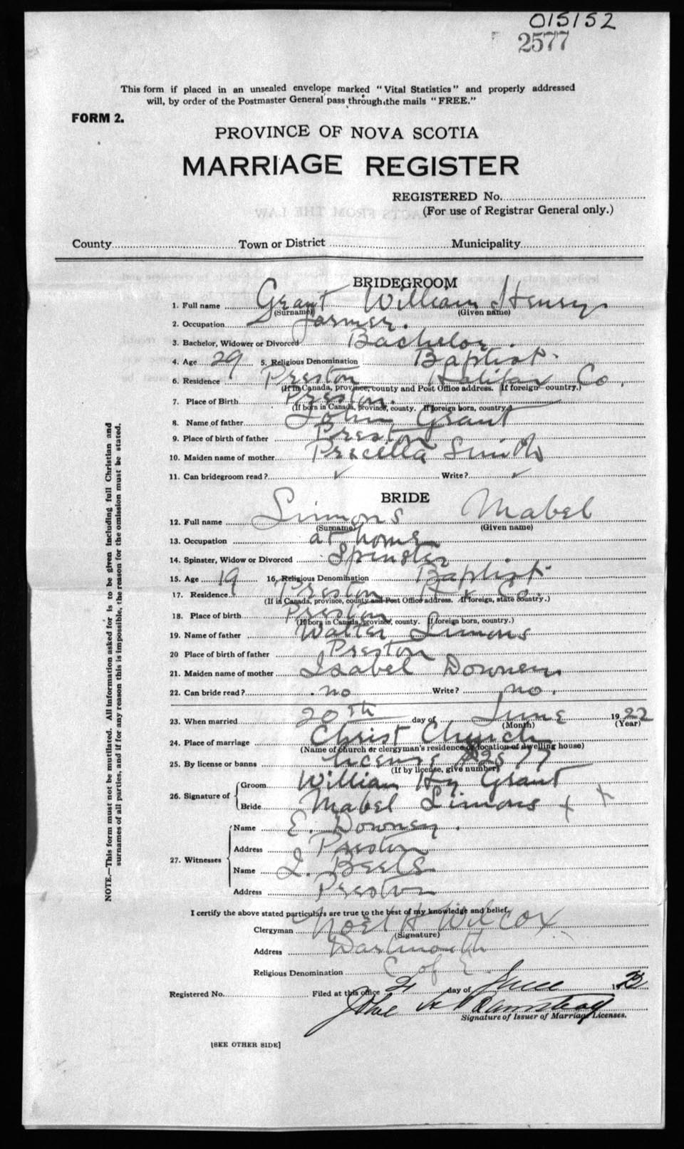 Registration: Year: 1922 number: 15152