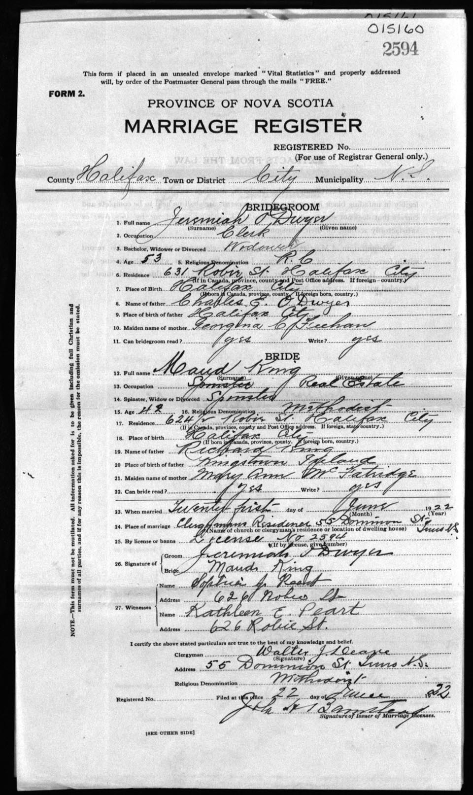 Registration: Year: 1922 number: 15160