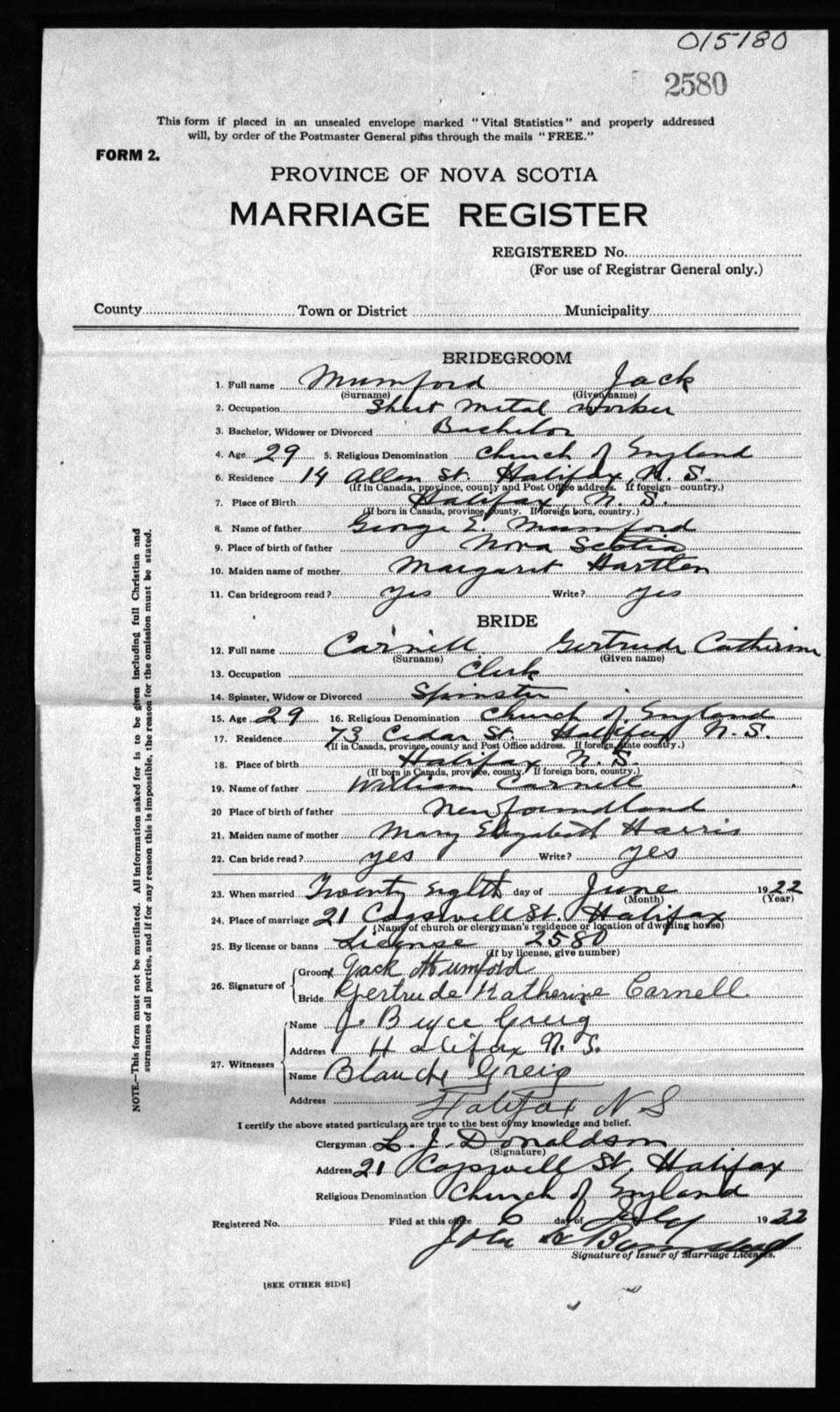 Registration: Year: 1922 number: 15180