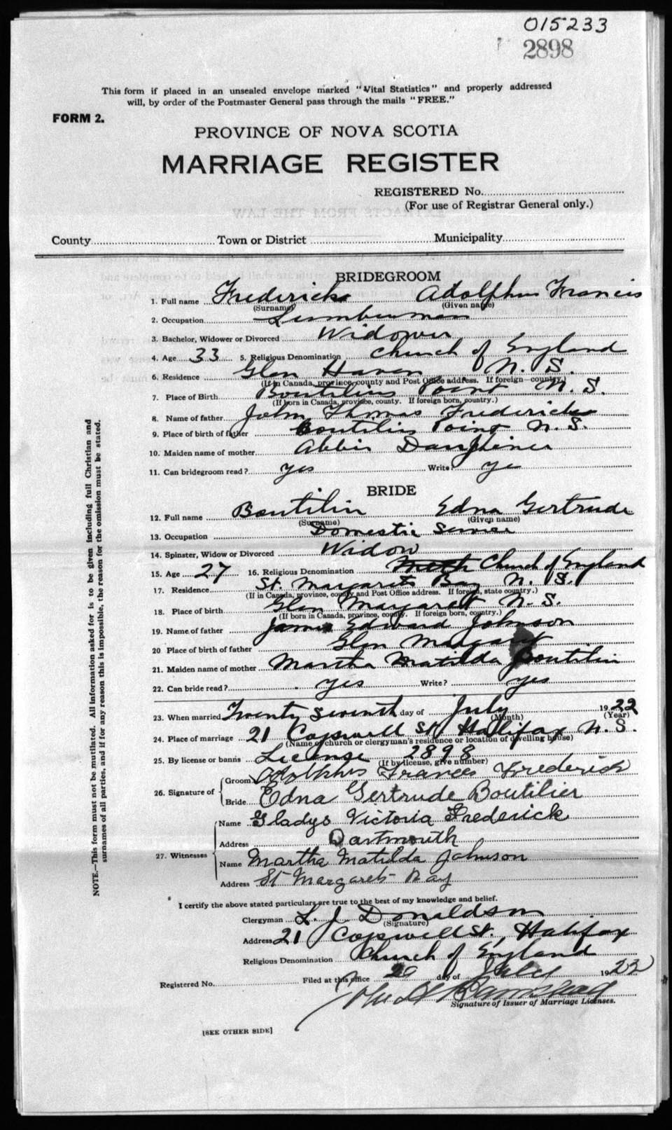 Registration: Year: 1922 number: 15233