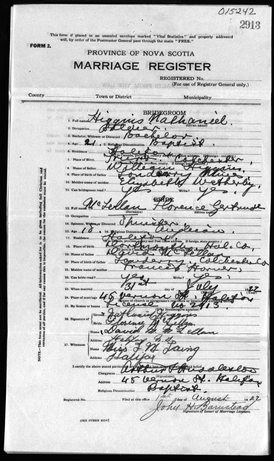Registration: Year: 1922 number: 15242