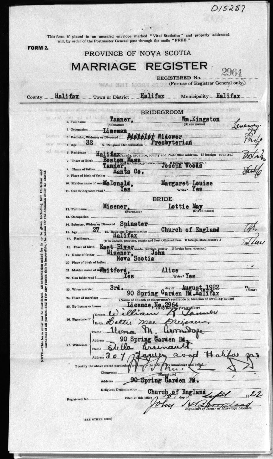 Registration: Year: 1922 number: 15257