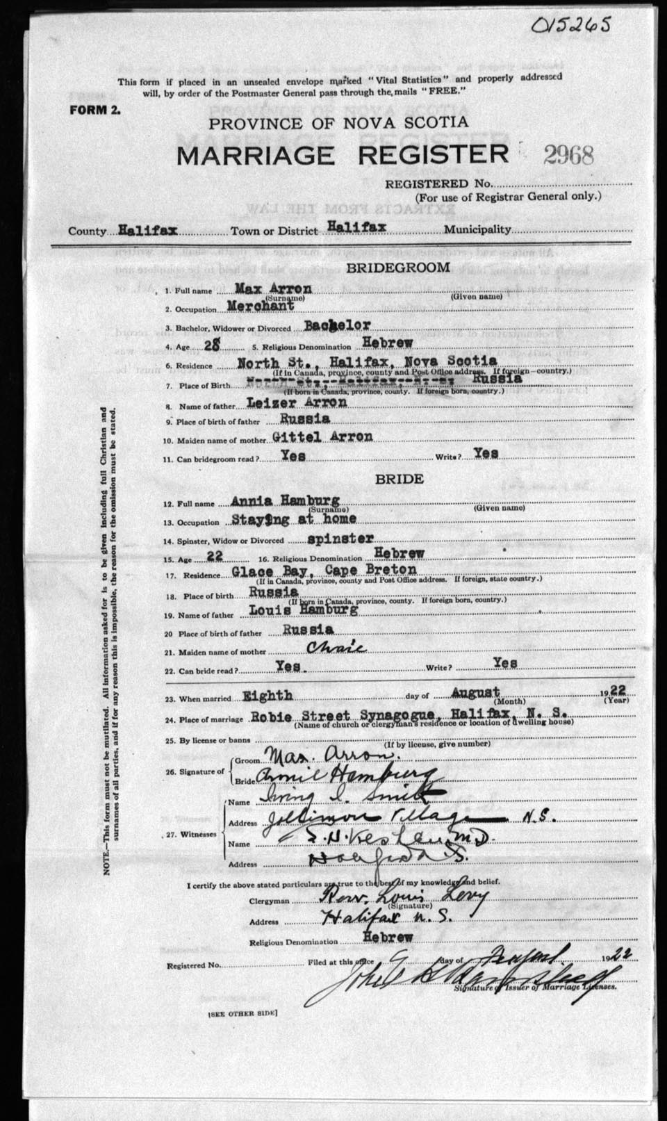 Registration: Year: 1922 number: 15265