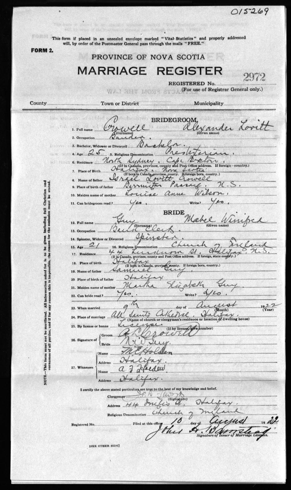 Registration: Year: 1922 number: 15269