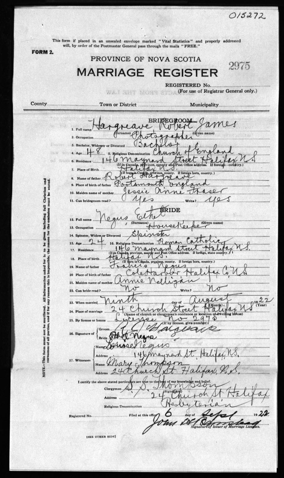 Registration: Year: 1922 number: 15272
