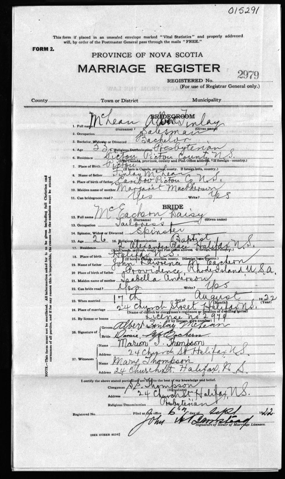 Registration: Year: 1922 number: 15291