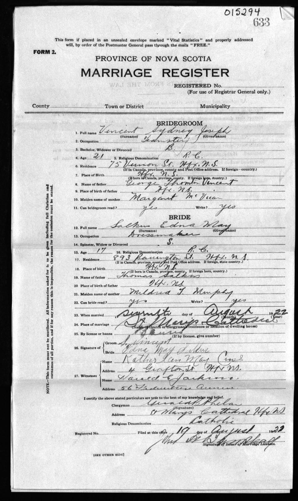 Registration: Year: 1922 number: 15294