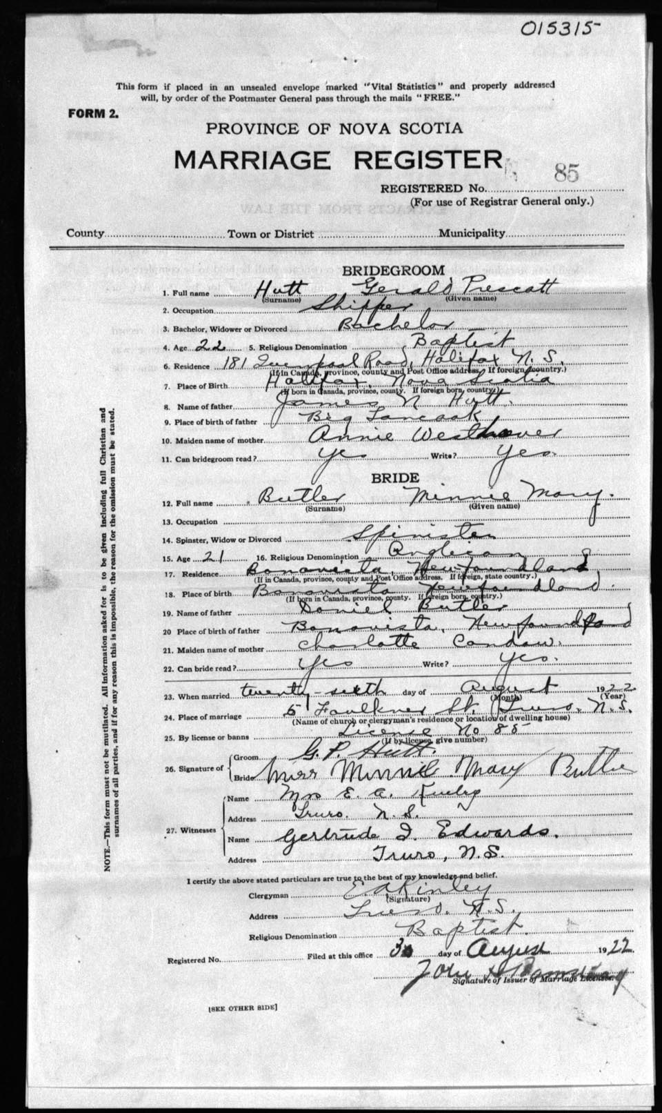 Registration: Year: 1922 number: 15315