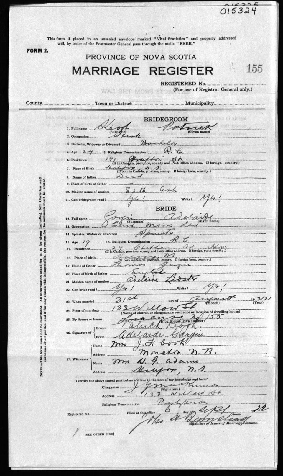 Registration: Year: 1922 number: 15324