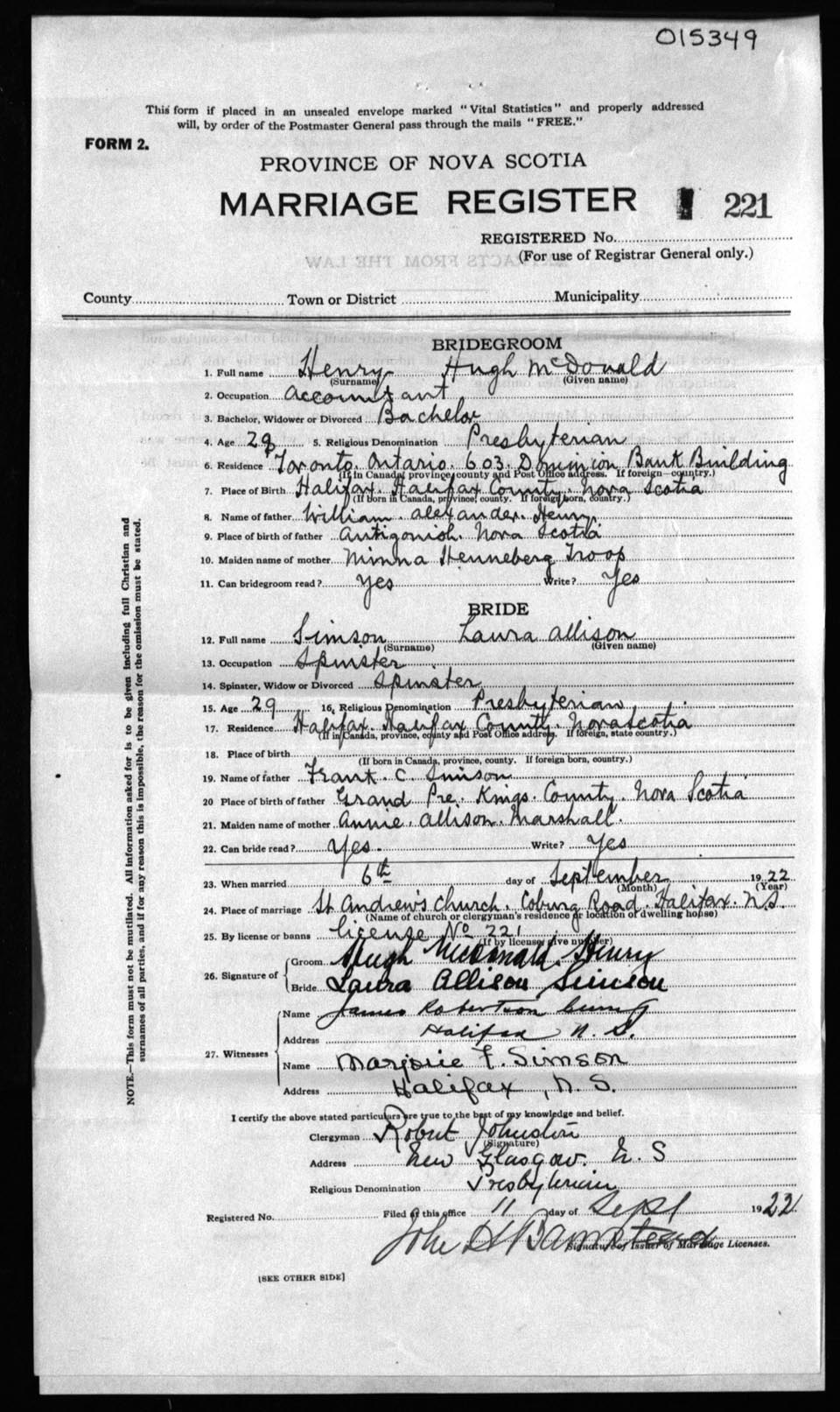 Registration: Year: 1922 number: 15349