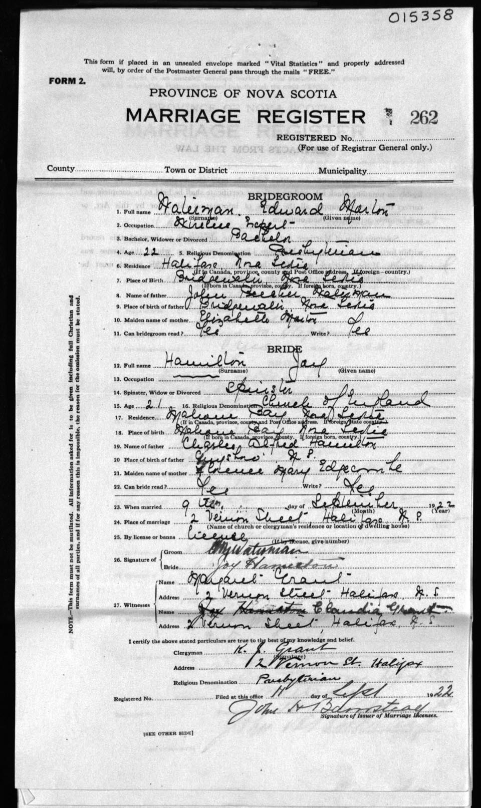 Registration: Year: 1922 number: 15358