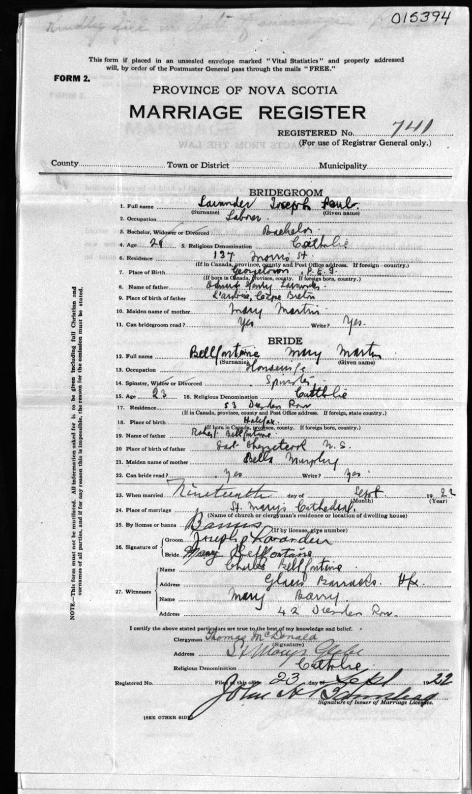 Registration: Year: 1922 number: 15394