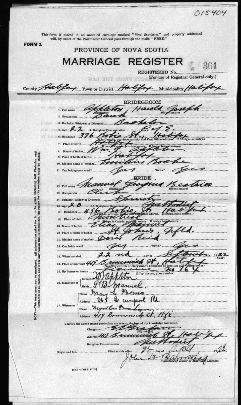 Registration: Year: 1922 number: 15404