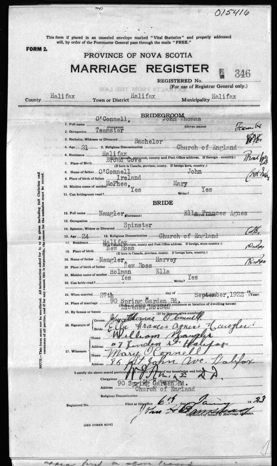 Registration: Year: 1922 number: 15416