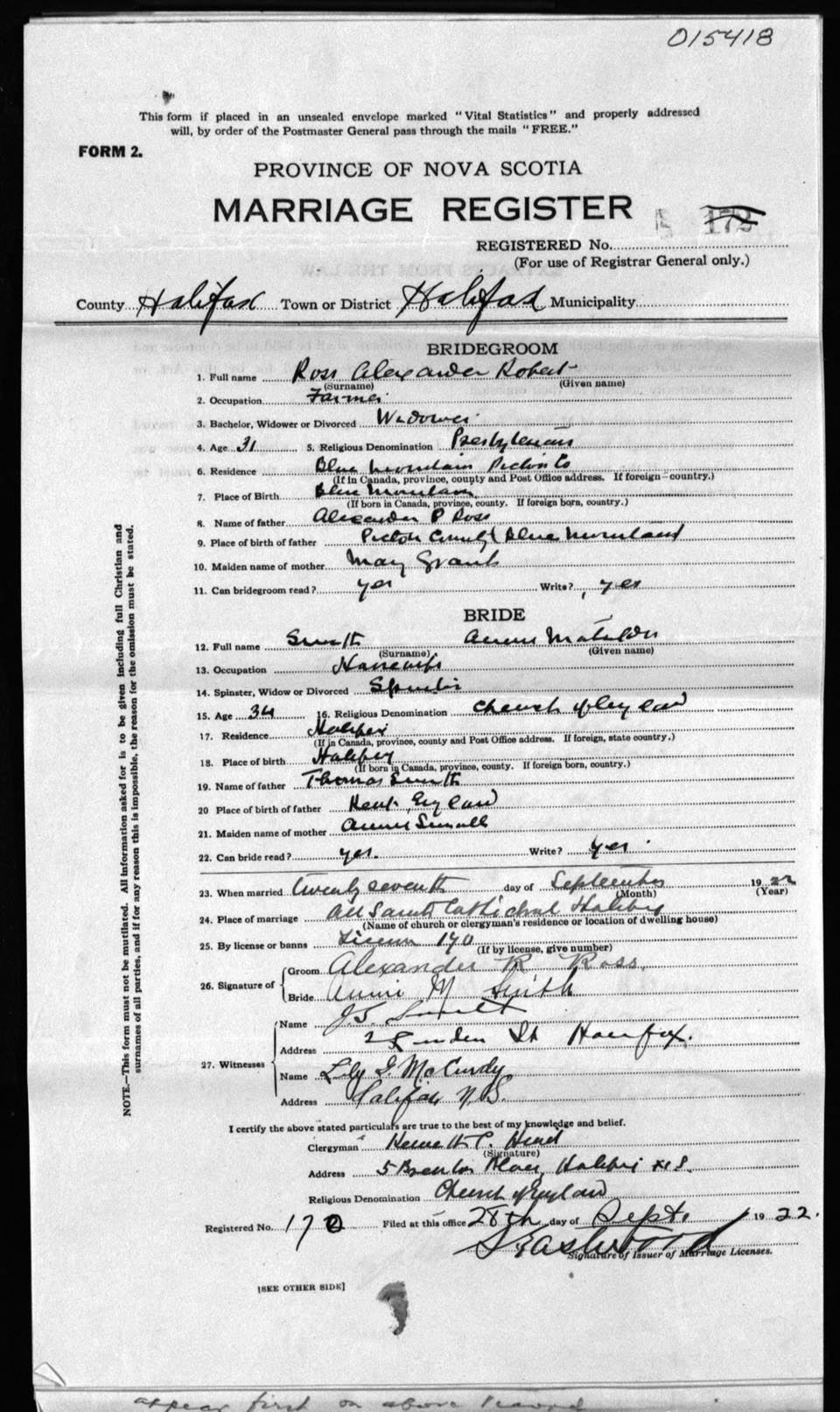 Registration: Year: 1922 number: 15418