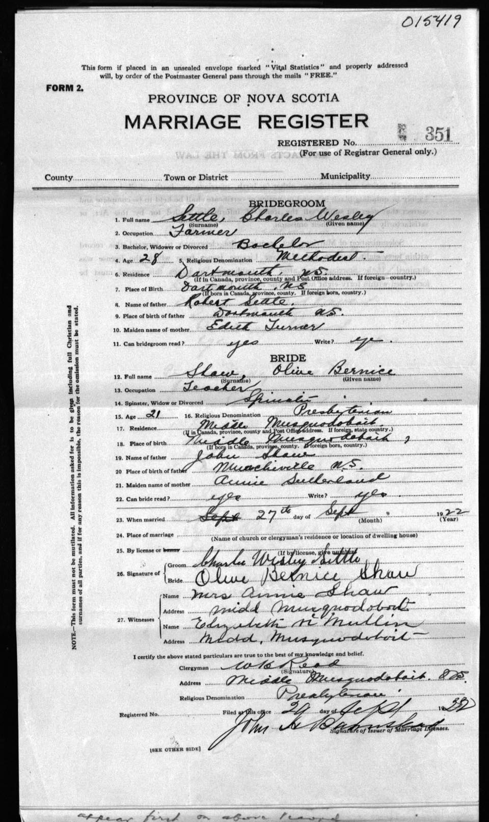Registration: Year: 1922 number: 15419