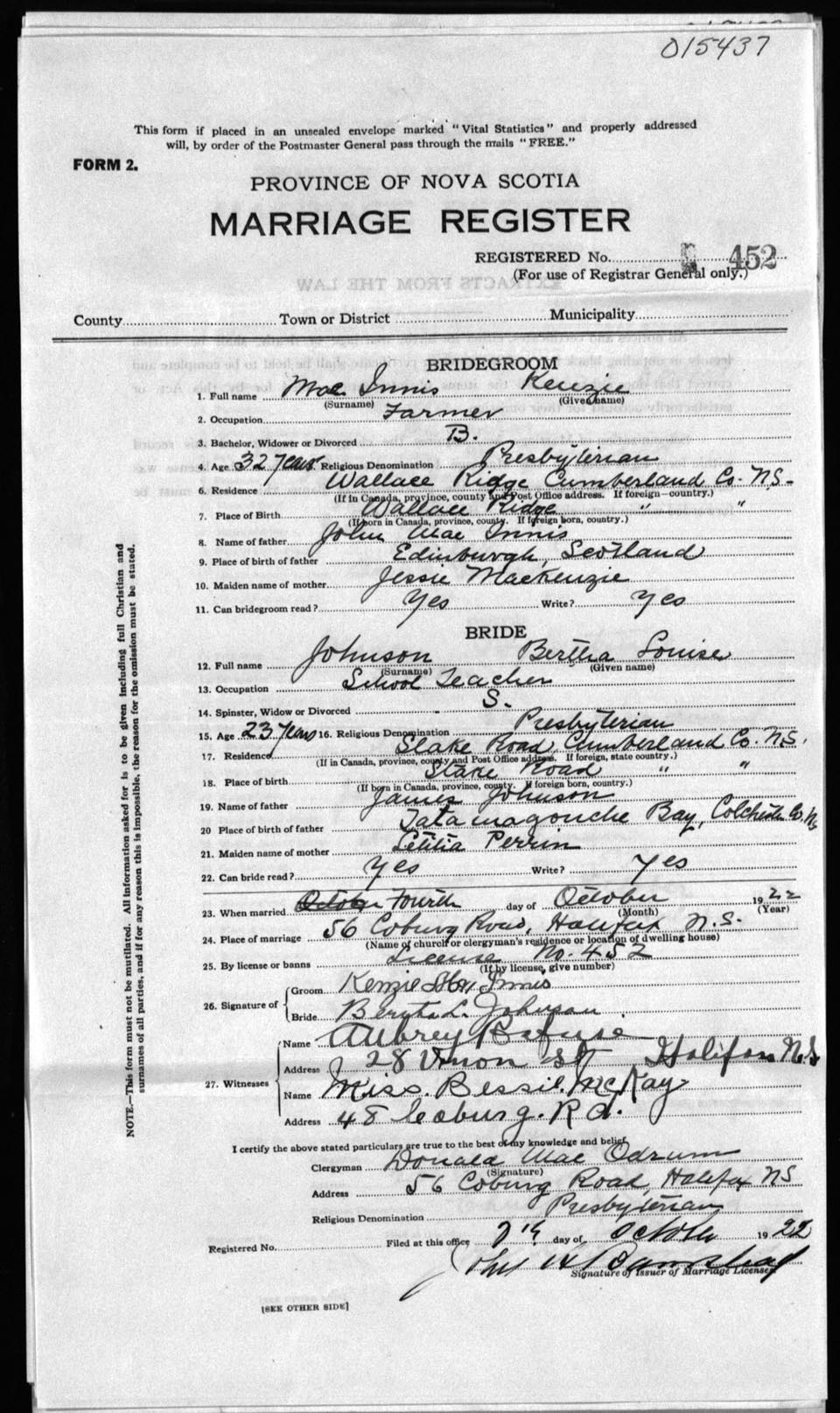 Registration: Year: 1922 number: 15437