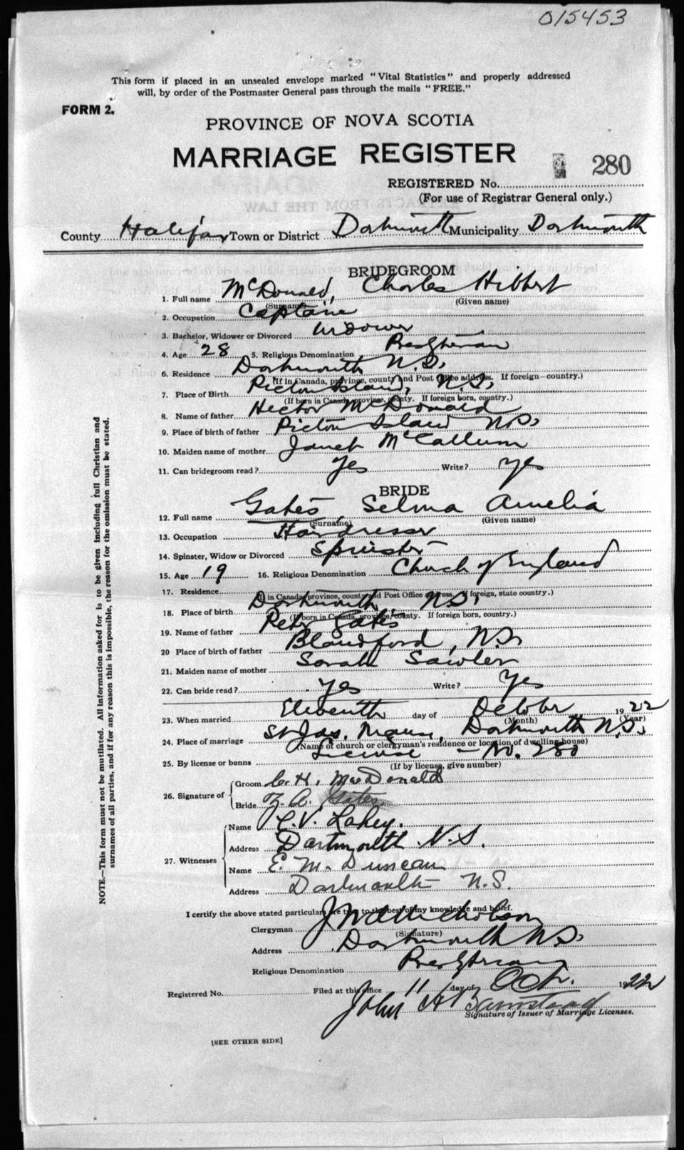 Registration: Year: 1922 number: 15453