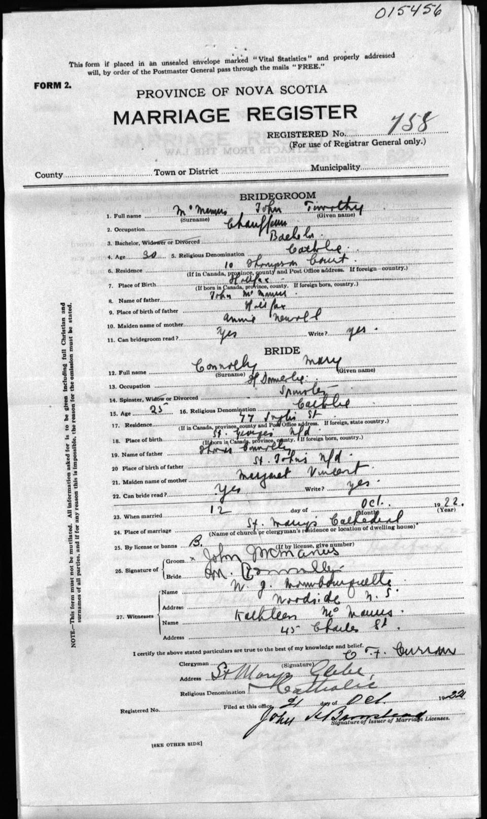 Registration: Year: 1922 number: 15456