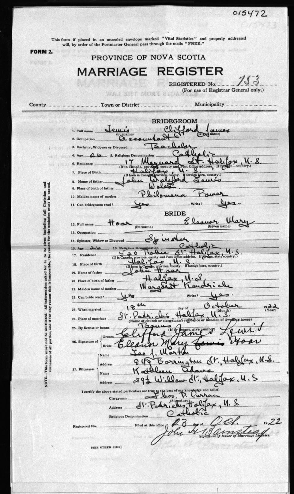 Registration: Year: 1922 number: 15472