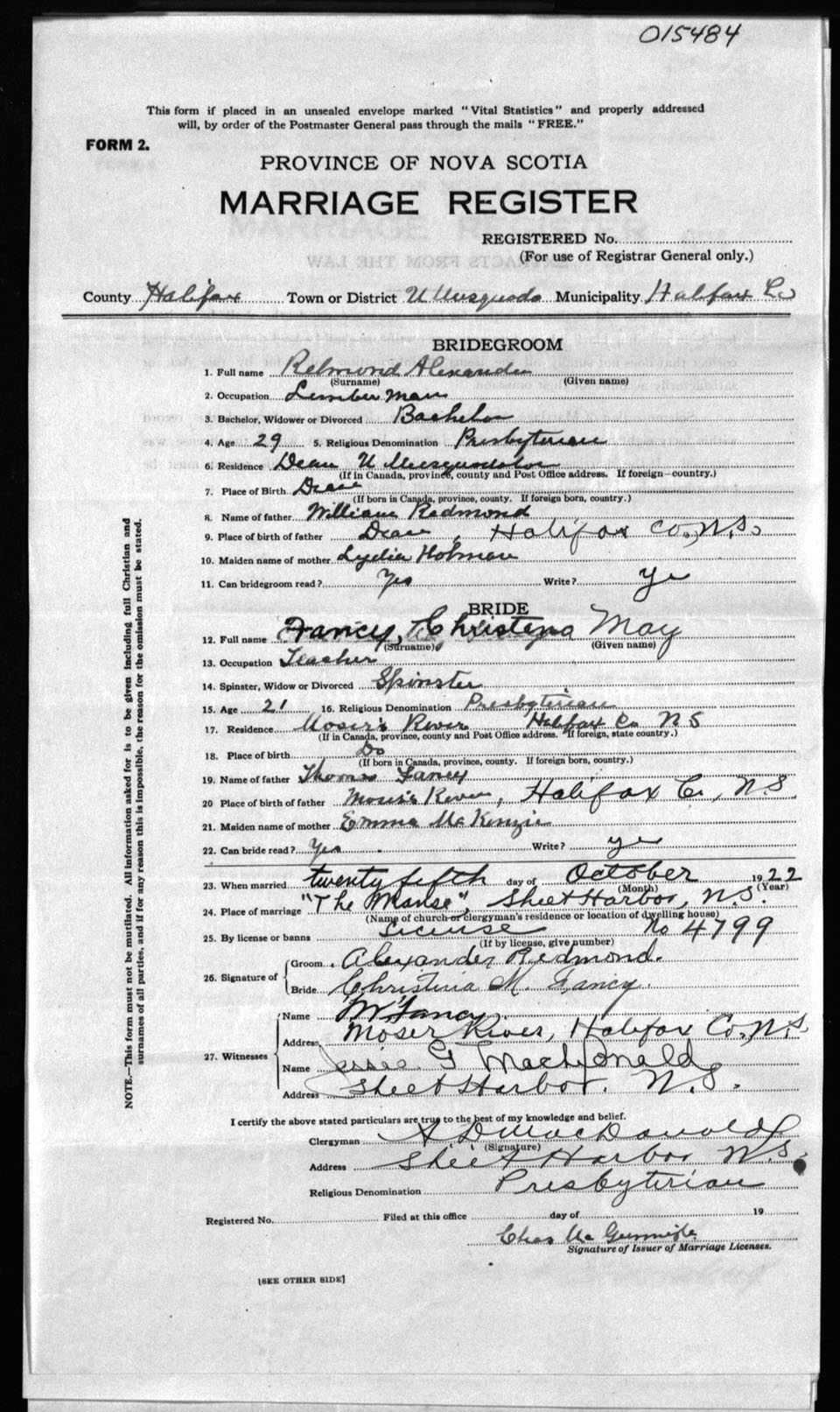 Registration: Year: 1922 number: 15484