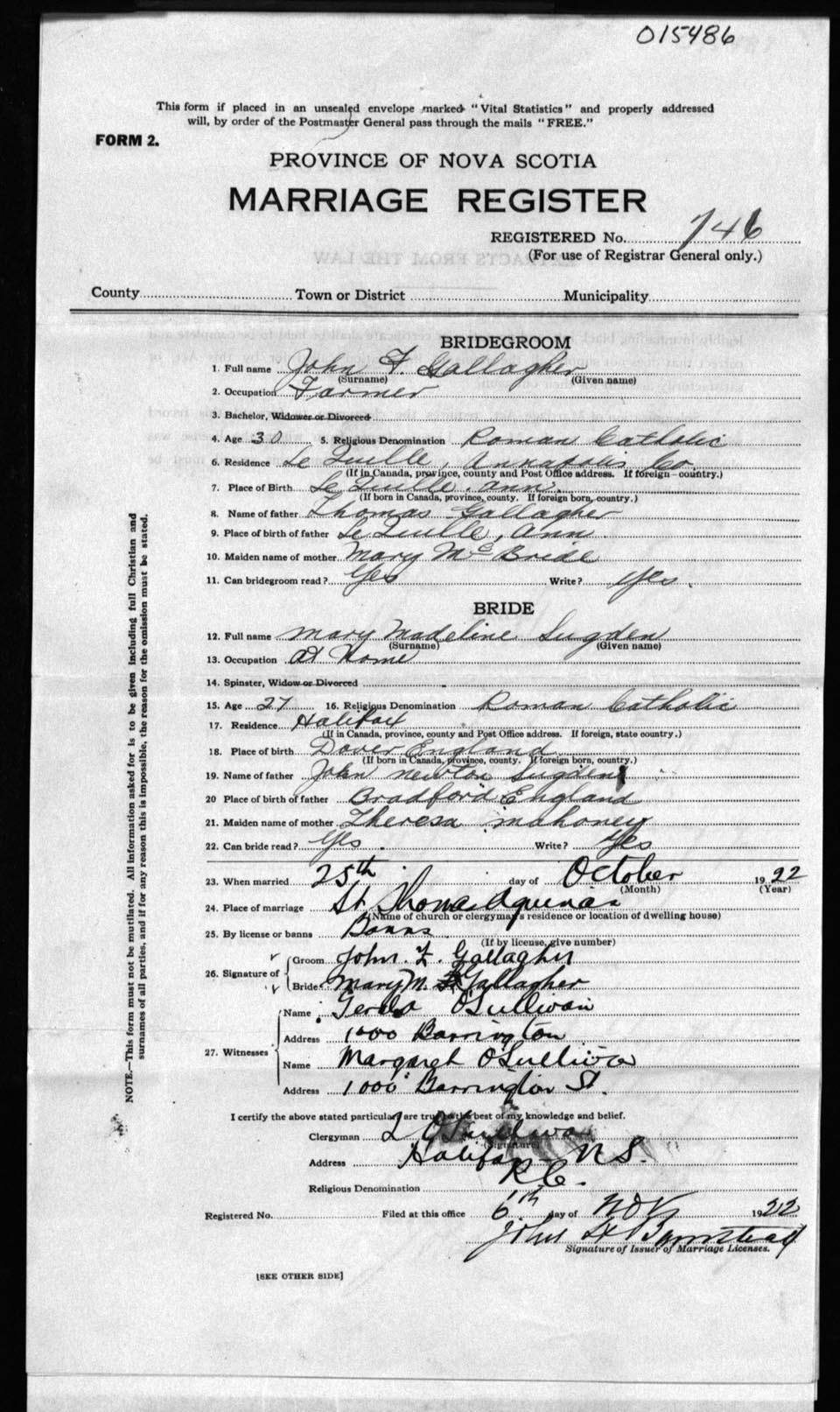 Registration: Year: 1922 number: 15486