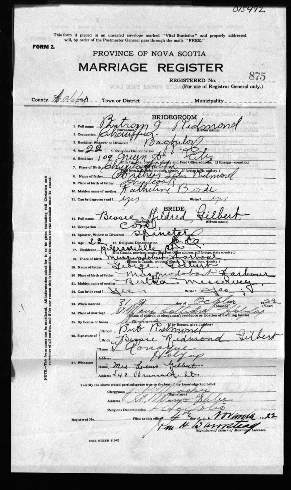 Registration: Year: 1922 number: 15492