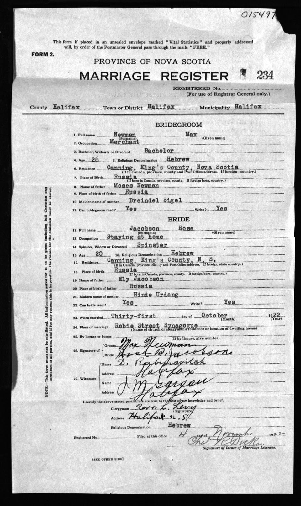 Registration: Year: 1922 number: 15497