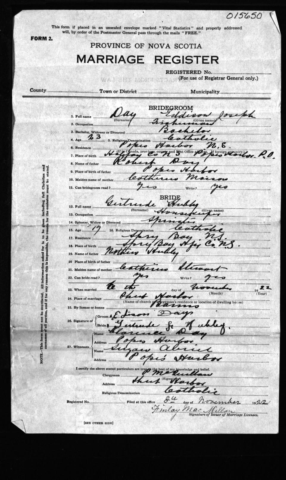 Registration: Year: 1922 number: 15650