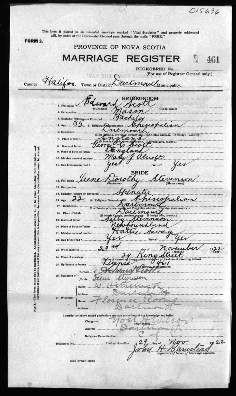 Registration: Year: 1922 number: 15696