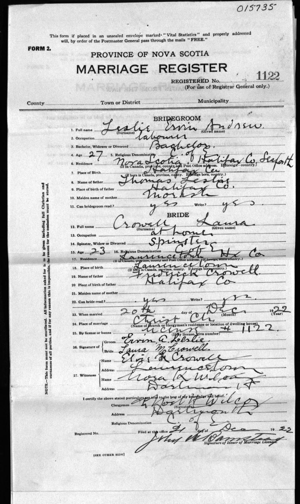 Registration: Year: 1922 number: 15735