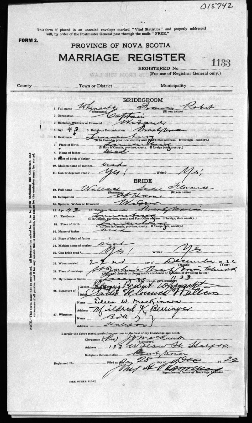 Registration: Year: 1922 number: 15742