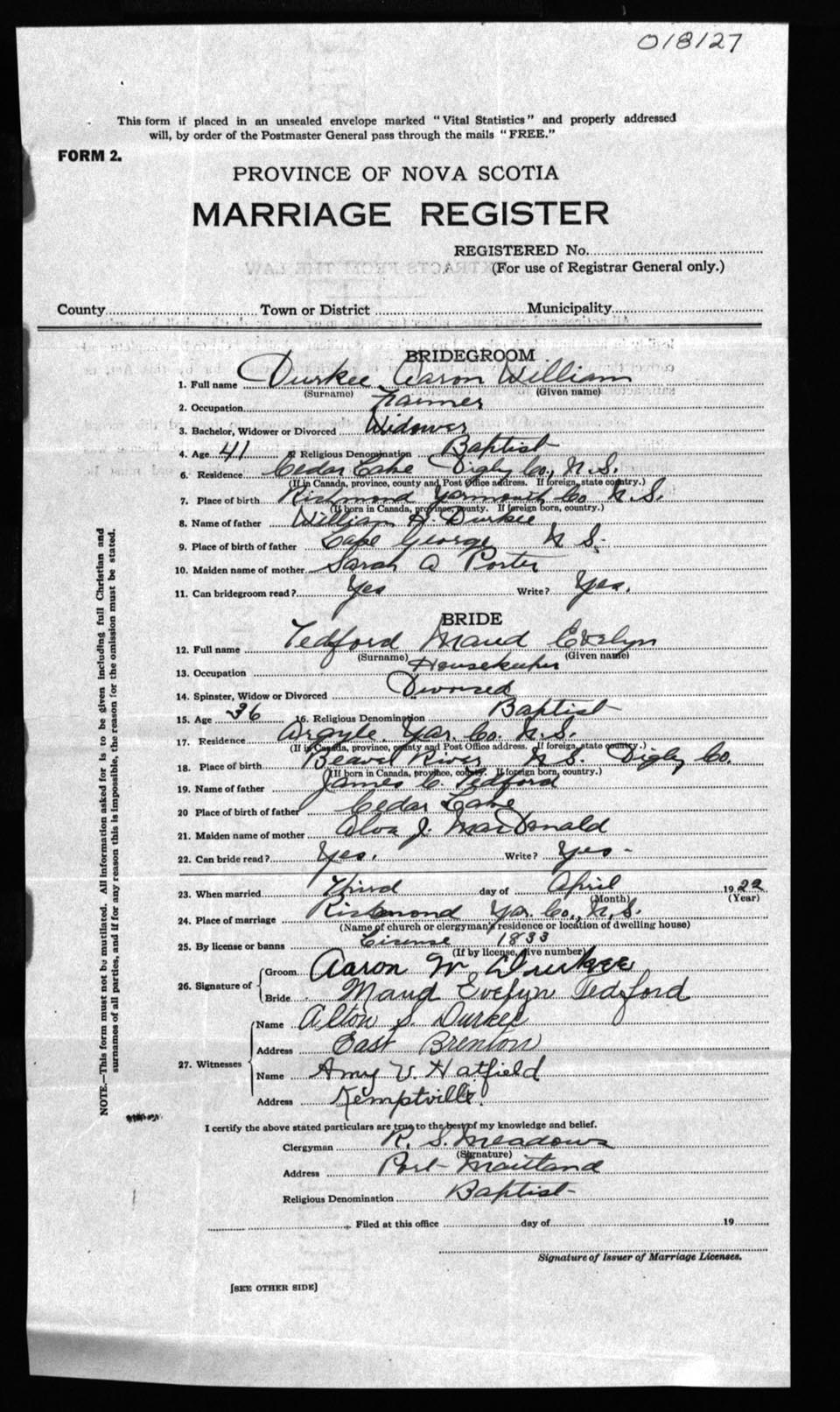 Registration: Year: 1922 number: 18127